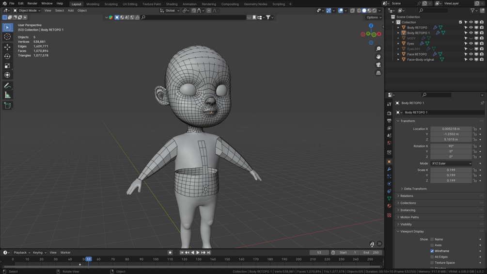 the character is fully sculpted, and the face is retopologized